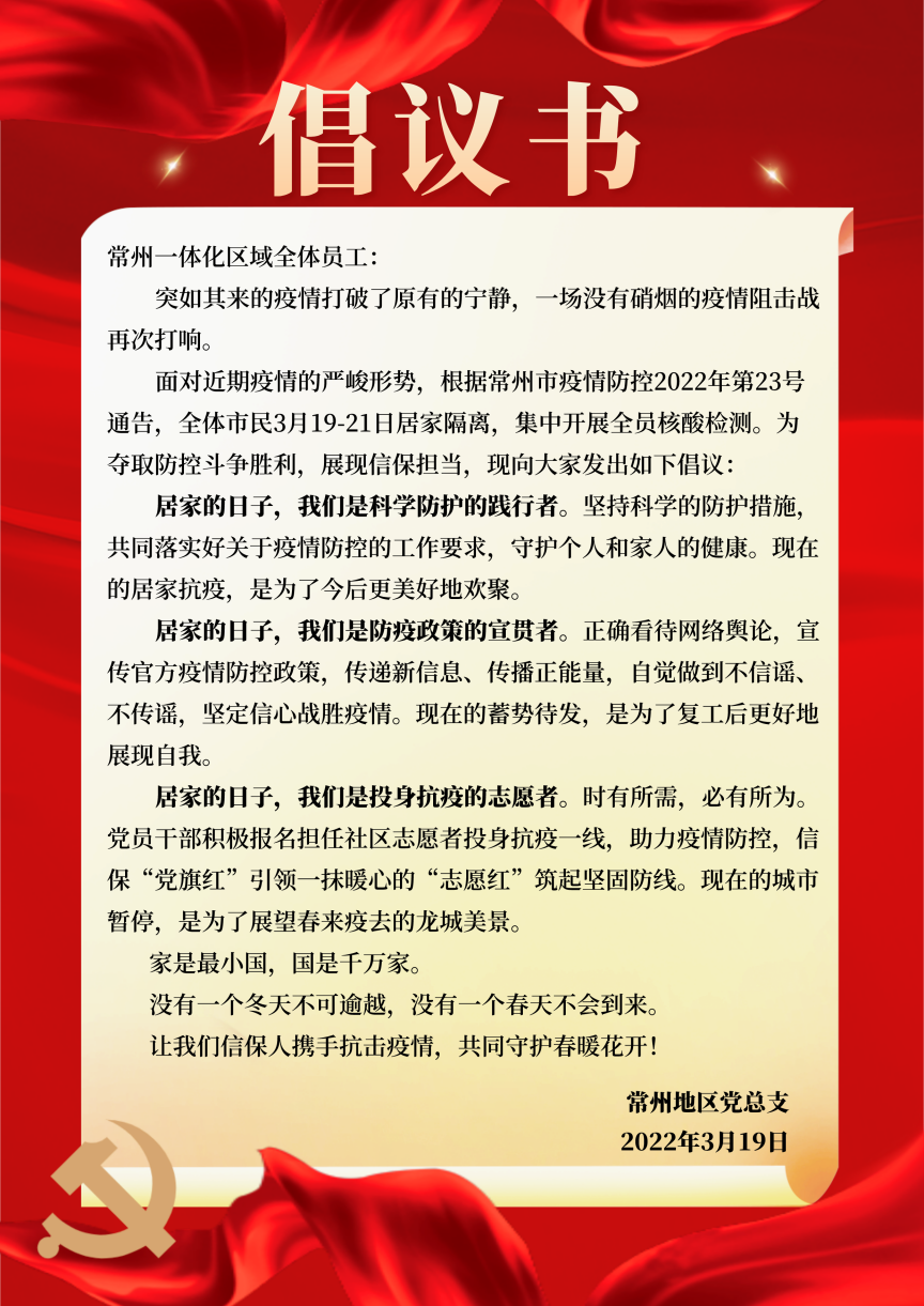 常州一體化區域領導班子召開專題會議,要求全體黨員干部把做好疫情防控工作作為當前重要政治任務,強化責任意識,層層壓實責任,盯住關鍵環節,有力有序落實落細各項防控措施,提升應對能力,落實物資保障,切實做到守土有責、為民負責、履職盡責。同時,常州地區黨總支發布倡議書,號召全體員工居家隔離期間爭當科學防護的踐行者、防疫政策的宣貫者、投身抗疫的志愿者,齊心協力守護好人民群眾生命安全和身體健康。