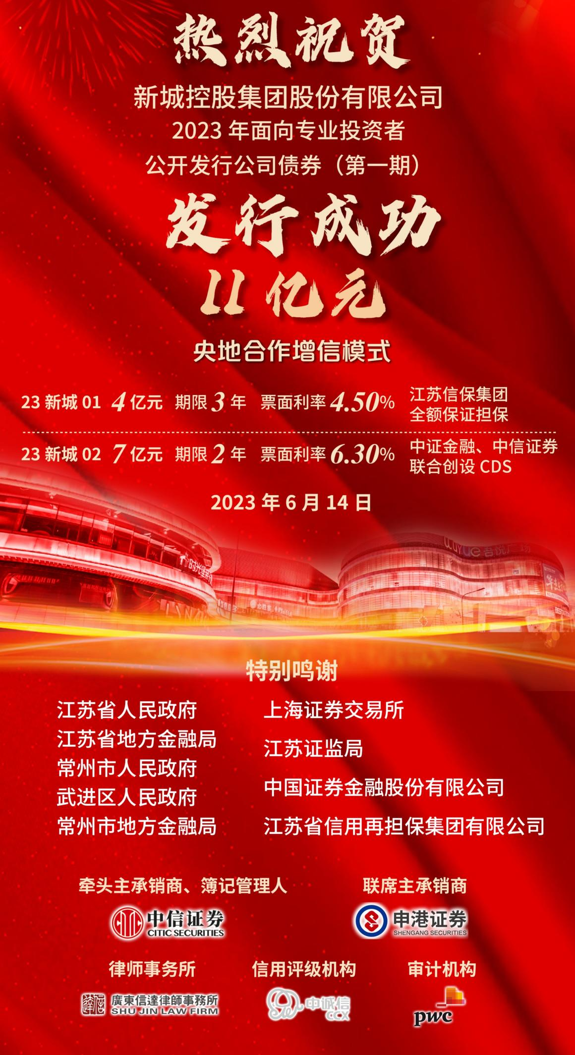 據(jù)悉,當(dāng)日發(fā)行吸引了眾多金融機構(gòu)踴躍參與投標(biāo)。該期債券規(guī)模共計11億元,分兩個品種發(fā)行。其中,債券“23新城01”發(fā)行規(guī)模4億元,期限3年,由江蘇省信用再擔(dān)保集團有限公司全額擔(dān)保,發(fā)行票面利率為4.50%。債券“23新城02”發(fā)行規(guī)模7億元,期限2年,由中國證券金融股份有限公司聯(lián)合中信證券創(chuàng)設(shè)信用緩釋工具,發(fā)行票面利率為6.30%。