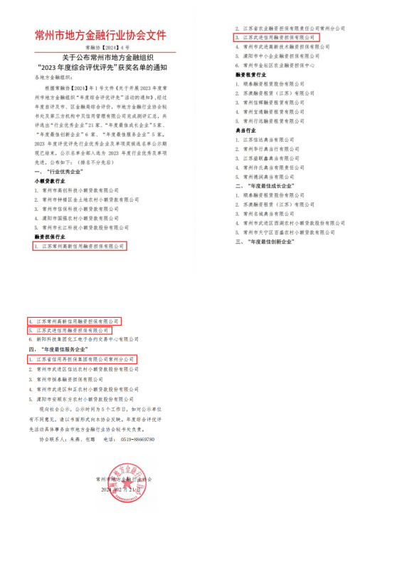 2月28日,常州市地方金融行業(yè)協(xié)會公布了地方金融組織“2023年度綜合評優(yōu)評先”獲獎名單,常州地區(qū)分子公司榜上有名,常州分公司榮獲“年度最佳服務(wù)企業(yè)”,武進擔(dān)保和常州高新?lián)9揪B續(xù)榮獲“行業(yè)優(yōu)秀企業(yè)”,同時被評為“年度最佳創(chuàng)新企業(yè)”。