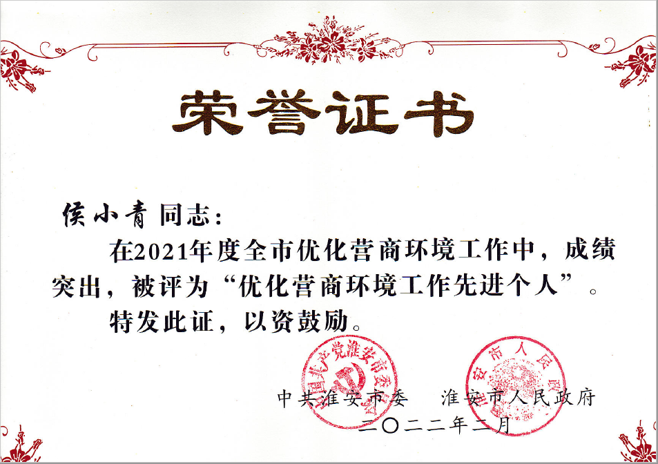 2月10日,淮安市重特大項(xiàng)目攻堅(jiān)暨優(yōu)化營(yíng)商環(huán)境大會(huì)召開(kāi),淮安分公司被市委市政府授予“2021年度優(yōu)化營(yíng)商環(huán)境先進(jìn)集體”、第三次被授予“優(yōu)化營(yíng)商環(huán)境流動(dòng)紅旗”、是全市為數(shù)不多獲此殊榮的金融機(jī)構(gòu)。分公司侯小青同志獲得“2021年度優(yōu)化營(yíng)商環(huán)境工作先進(jìn)個(gè)人”榮譽(yù)稱(chēng)號(hào)。