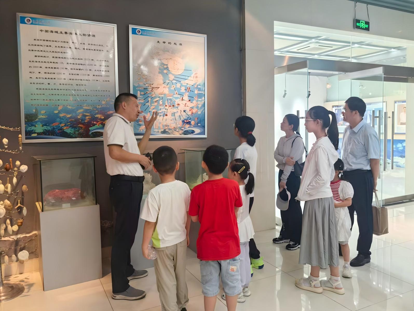 在專業(yè)講解員的帶領(lǐng)下,孩子們近距離觀察了館內(nèi)1200余件珍貴生物標(biāo)本,涵蓋原生類、貝類、甲殼類、魚類及藻類等。通過生動有趣的互動講解,大家深入了解中國海域的生物多樣性,特別是中華鱘、珊瑚等瀕危物種的保護意義。活動特別安排了江蘇海洋大學(xué)海洋生物技術(shù)重點實驗室的參觀環(huán)節(jié),孩子們通過顯微鏡觀察浮游生物,直觀感受科技在海洋生態(tài)研究中的應(yīng)用,點燃了對海洋科學(xué)的興趣。員工與子女?dāng)y手參與知識問答、標(biāo)本觸摸等互動環(huán)節(jié),在協(xié)作中增進情感,共同樹立"守護蔚藍星球"的環(huán)保理念。