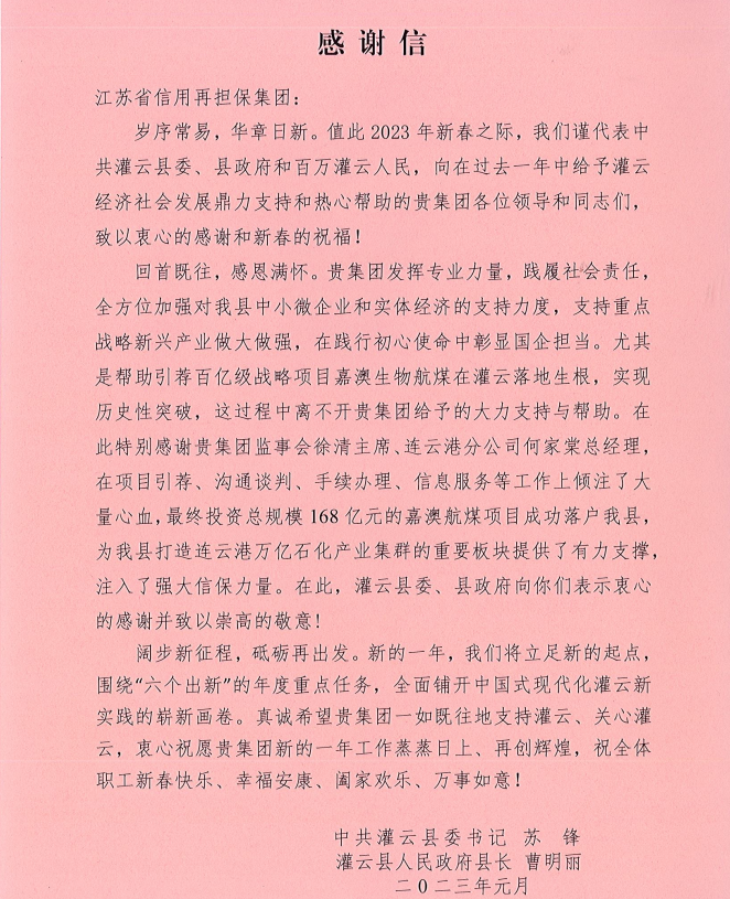 日前,連云港市灌云縣向集團發來感謝信,感謝集團長期以來對灌云縣中小微企業和實體經濟的大力支持,尤其是連云港分公司助力引薦百億級戰略項目嘉澳生物航煤項目落戶灌云。