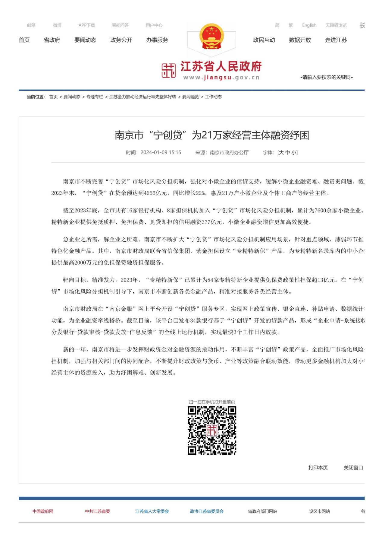 近日,江蘇省人民政府官網(wǎng)以《南京市“寧創(chuàng)貸”為21萬(wàn)家經(jīng)營(yíng)主體融資紓困》為題,對(duì)南京一體化區(qū)域的“寧創(chuàng)貸”市場(chǎng)化風(fēng)險(xiǎn)分擔(dān)機(jī)制進(jìn)行了宣傳報(bào)道,充分肯定了“寧創(chuàng)貸”市場(chǎng)化風(fēng)險(xiǎn)分擔(dān)機(jī)制及其包含的“專精特新保”產(chǎn)品在助企融資紓困方面取得的成效。