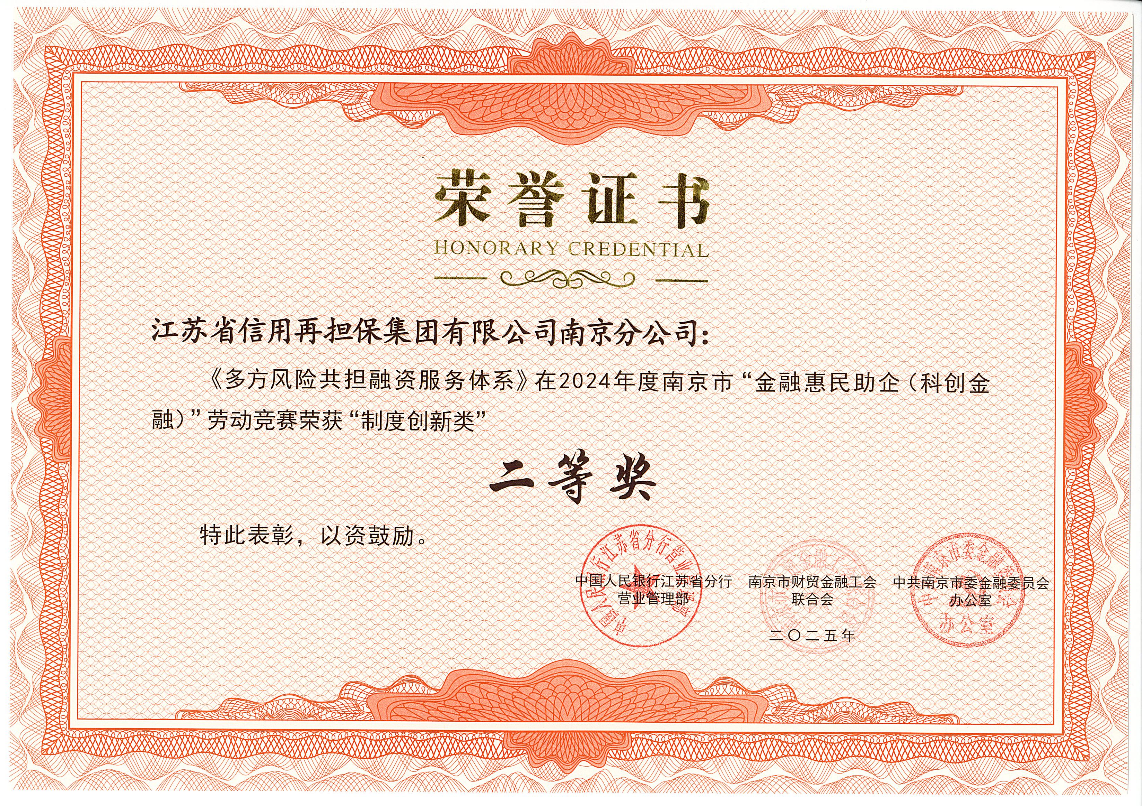 本獎項由中國人民銀行江蘇省分行、南京市財貿金融工會及中共南京市委金融委員會聯合授予,分公司作為本屆勞動競賽中唯一獲獎的擔保機構進行交流發言。多年來,南京分公司始終圍繞集團戰略部署,服務地方發展、踐行社會責任。該項榮譽的獲得體現了人民銀行江蘇省分行、南京市委金融辦等監管部門對集團聚焦“擔保跟著產業走、跟著項目走、跟著資金走、跟著就業走、跟著科創走、跟著‘兩新’‘兩重’等新經濟增長點走”六條賽道的高度認可。