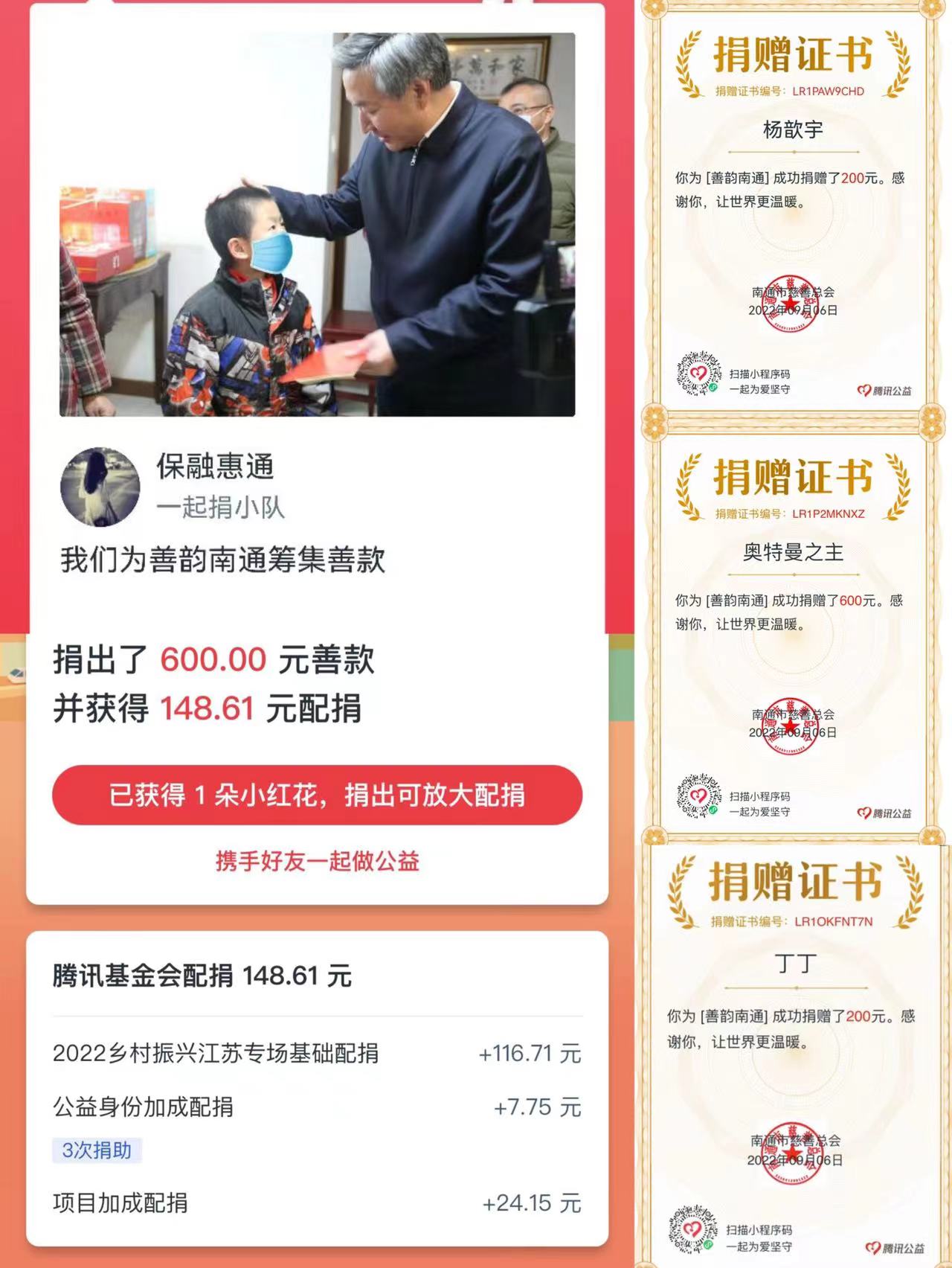 本次慈善一日捐活動,南通地區黨支部通過“騰訊公益”小程序組建“保融惠通” 捐小隊開展統一捐款。公司全體員工踴躍參與,通過線上捐贈善款,這筆善款將統一交至南通市慈善總工會,用于特困未成年人關愛服務等慈善救助項目,為南通地區的慈善事業貢獻信保力量,目前已有38個金融機構參與本次活動。