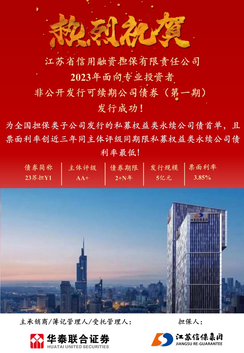 本期債券由華泰聯合證券主承銷,一經推出即獲得投資者踴躍響應,多家銀行、基金、資管等投資者爭相參與市場化認購,最終發行規模5億元,主體評級AA+,期限2+N年期,票面利率3.85%。本期債券為全國同類型擔保公司發行的私募權益類永續公司債首單,且票面利率創近三年同主體評級同期限私募權益類永續公司債利率最低。