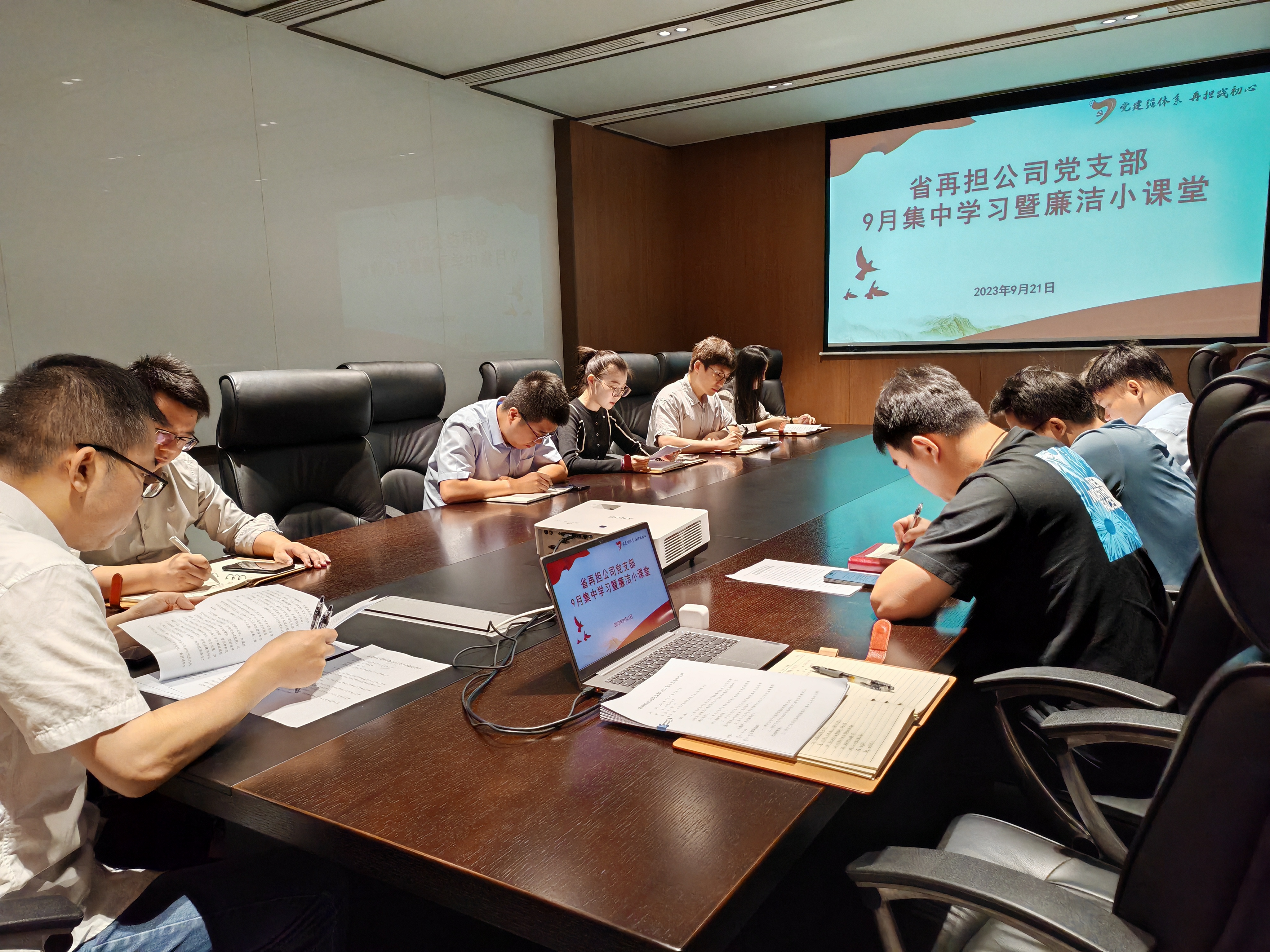 9月21日上午,省再擔公司黨支部開展9月集中學習暨廉潔小課堂活動。公司相關負責人主持會議,全體黨員、入黨積極分子參加學習研討。