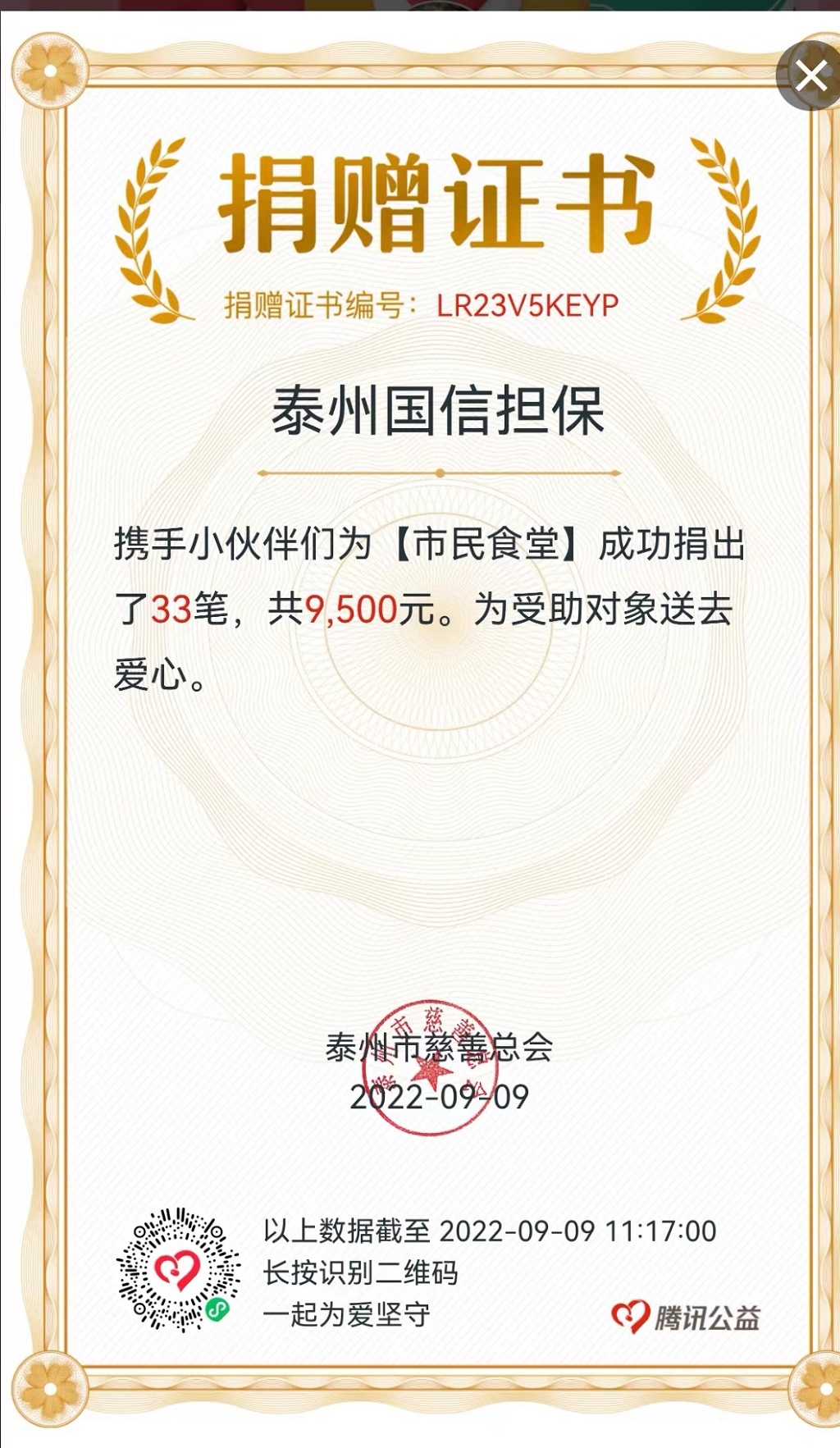 一年一度的中華慈善日來臨之際,在得知姜堰區正在打造老年人助餐中心,姜堰金融局在金融系統發起“我們為市民食堂籌集善款”活動的消息后,泰州國信擔保積極響應,開展“慈善一日捐”活動,廣大黨員帶頭,干部員工積極踴躍捐款,共計捐款10200元(其中通過騰訊公益單位組隊形式捐款9500元,個人渠道捐款700元),助力姜堰區老年人助餐中心建設。