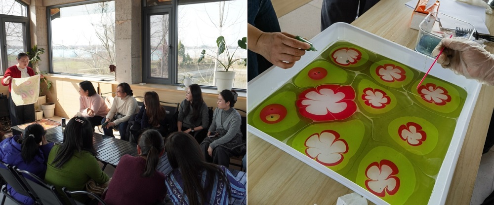 在非遺體驗活動現場,大家根據自己的喜好,將染料滴入水中,或輕輕撥動水面,或精準滴落,層層疊疊的顏色在水面上緩緩鋪展,相互交織,相互融合,最終,這些圖案被巧妙地轉移到絲巾上,每條絲巾都成為了獨一無二的“手工限量版”。