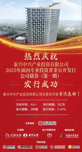 4月24日,泰興中興產(chǎn)業(yè)投資有限公司2025年面向?qū)I(yè)投資者非公開發(fā)行公司債券(第一期)在上交所成功發(fā)行,發(fā)行規(guī)模5億元,期限3年,發(fā)行票面利率2.4%,本期債券由集團(tuán)增信擔(dān)保,為企業(yè)在交易所實(shí)現(xiàn)首次亮相提供了有力支持。