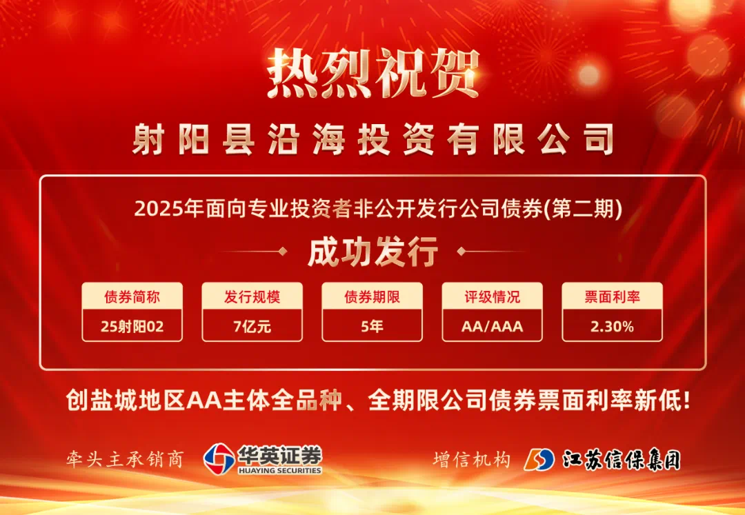 2月17日,由集團增信的射陽縣沿海投資有限公司2025年第二期私募債成功簿記建檔發行,規模7億元,期限純5年,票面利率2.3%,全場認購倍數3.97倍,創鹽城地區AA主體全品種、全期限公司債券票面利率新低。