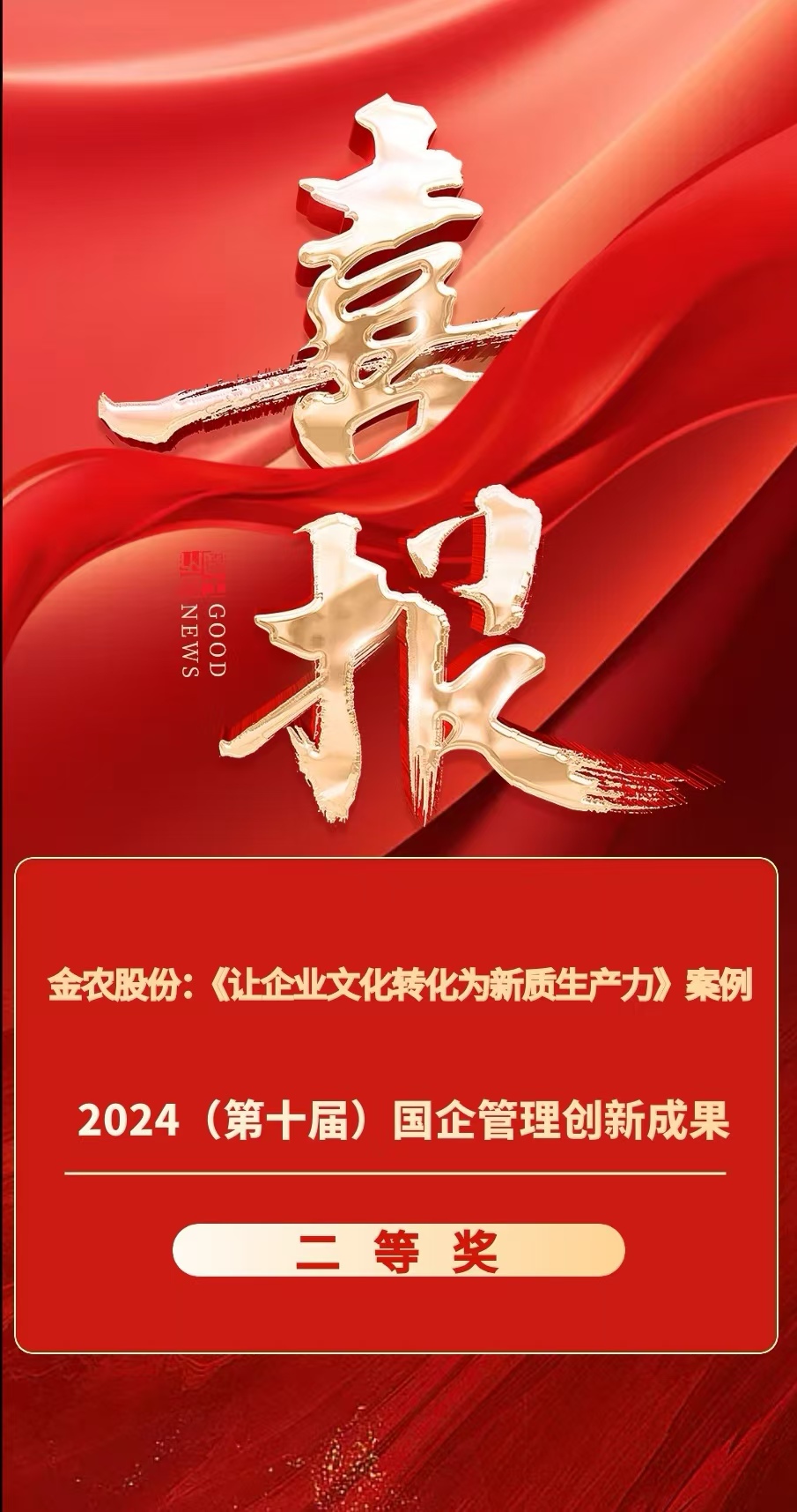 12月21日,由中國工業合作協會、中國管理科學學會、中國輕工業出版社、中國知網、《創新世界周刊》、《國企管理》雜志等聯合主辦的2024(第十屆)國企管理年會暨國企管理創新成果發布儀式在北京舉行。財政部原副部長朱光耀、國務院國有重點大型企業監事會原主席季曉南出席會議并致辭。會上發布了2024國企管理創新成果(案例),《金農股份:讓企業文化轉化為新質生產力》(案例),榮獲2024(第十屆)國企管理創新成果二等獎。