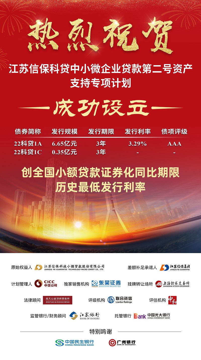 6月28日,江蘇信??瀑J中小微企業貸款第2期資產支持專項計劃成功發行,該項目總規模20億元,本次發債規模7億元,期限3年,票面利率3.29%,創全國3年期小額貸款ABS利率最低水平。