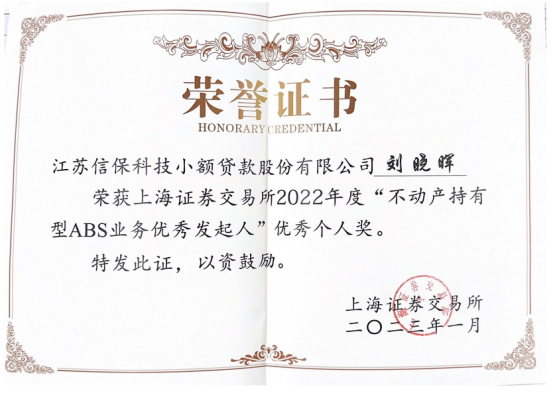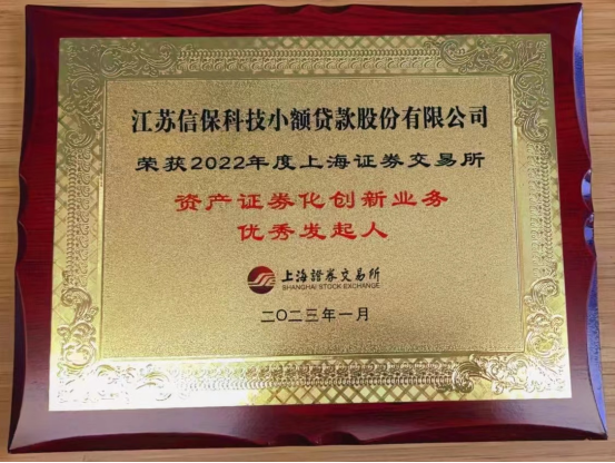 近日,江蘇信保科貸公司榮獲上海證券交易所頒發(fā)的“2022年度資產(chǎn)證券化創(chuàng)新業(yè)務(wù)優(yōu)秀發(fā)起人”獎(jiǎng)項(xiàng),公司董事長(zhǎng)總經(jīng)理劉曉暉榮獲上海證券交易所2022年度“不動(dòng)產(chǎn)持有型ABS業(yè)務(wù)優(yōu)秀發(fā)起人”優(yōu)秀個(gè)人獎(jiǎng)。