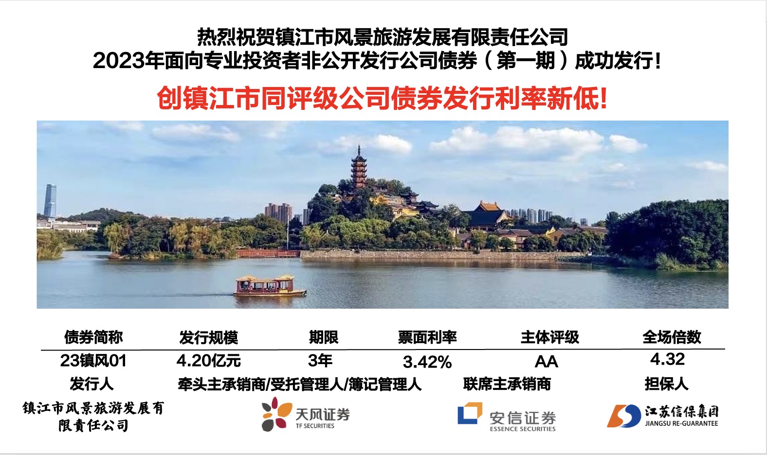 10月13日,鎮江一體化區域聯合集團區域金融部、資金運營部推動的首單采用“投債聯動”方式的“總包”綜合金融服務項目---鎮江市風景旅游發展有限責任公司 2023年面向專業投資者非公開發行公司債券(第一期)成功簿記發行,發行規模4.2億元,發行期限3年,全場認購倍數4.32,最終票面利率3.42%,創鎮江市同評級公司債發行利率新低。