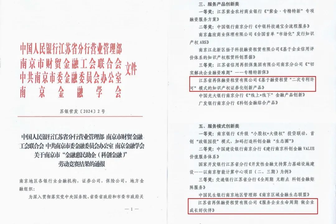 日前,在由人民銀行江蘇省分行營(yíng)管部、南京市委金融辦、南京市財(cái)貿(mào)金融工會(huì)聯(lián)合會(huì)、南京金融學(xué)會(huì)共同舉辦的南京市“金融惠民助企(科創(chuàng)金融)”勞動(dòng)競(jìng)賽中,江蘇信保租賃公司“二次專(zhuān)利許可”模式的知識(shí)產(chǎn)權(quán)證券化項(xiàng)目榮獲服務(wù)產(chǎn)品創(chuàng)新類(lèi)三等獎(jiǎng)、“服務(wù)企業(yè)生命周期 做企業(yè)成長(zhǎng)好伙伴”項(xiàng)目榮獲服務(wù)模式創(chuàng)新類(lèi)三等獎(jiǎng),是所有獲獎(jiǎng)單位里唯一一家斬獲多個(gè)獎(jiǎng)項(xiàng)的非銀金融機(jī)構(gòu)。